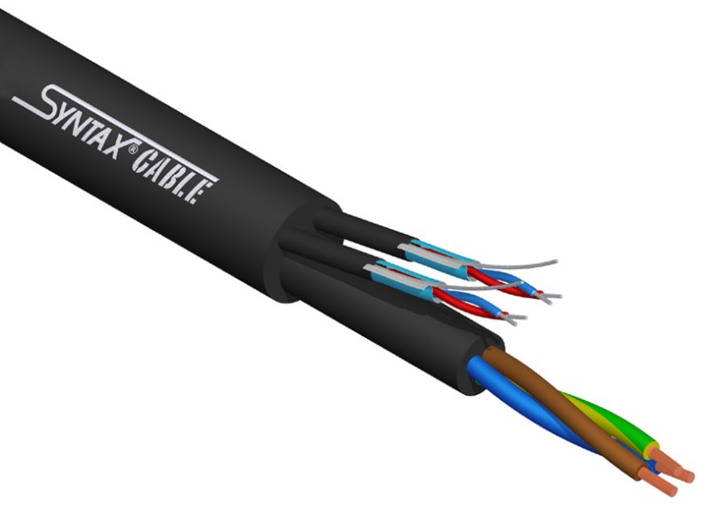 The SYNTAX® POWER+DIGITAL is a hybrid cable with a jacketed 3 x 1.5 mm² mains power cable combined with one or two DMX twisted pairs (7XD1F315SX or 7XD2F315SX). The digital signal pair is shielded by an aluminium/polyester foil screen and covered with a black PVC jacket. The power line is equipped with its own PVC jacket for added safety in compliance with the I.E.C. regulation. Suitable for parallel controls of light mixing boards via power line and DMX signal via digital cable. Also used for analogic audio cabinets when power is supplied. The external flame-retardant black PVC jacket is very flexible, trampling-proof, impact absorbing and water-proof.