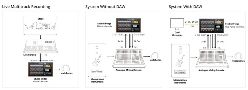 Uanset om du optager i et personligt studie eller i et live-miljø, fungerer Tascam Studio Bridge som et bindeled mellem dit eksisterende udstyr og supplerer det med den nyeste optageteknologi og brugervenlighed i et rack-monterbart format.